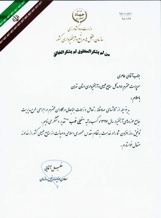 طی مراسمی که در موسسه تحقیقات جنگل ها و مراتع و با حضور مهندس خلیل آقائی معاون وزیر جهاد کشاورزی و رئیس سازمان جنگل ها، مراتع و آبخیزداری کشور و مدیران ستادی و استانی منابع طبیعی برگزار شد، از عملکرد منابع طبیعی استان تهران در اجرای طرح مدیریت جامع حوزه های آبخیز در سال 1397 تقدیر به عمل آمد.